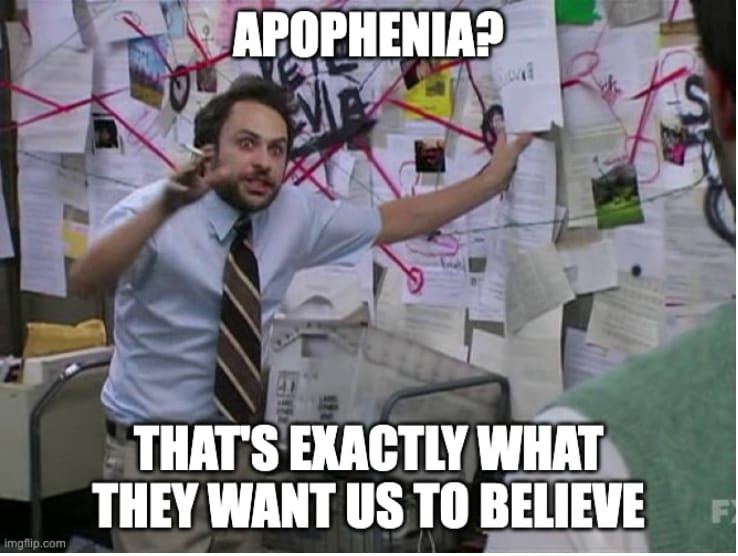 We know the term for that excess patternicity—it's called apophenia. It’s a term, at least for me, that has become a core psychological force in how I see our making sense of the world these days. But in a nutshell, apophenia is triggered by an excess of dopamine in our systems—an overwhelm of salience (a "pay attention, this matters-ness") and an overriding of normal and healthy skepticism.